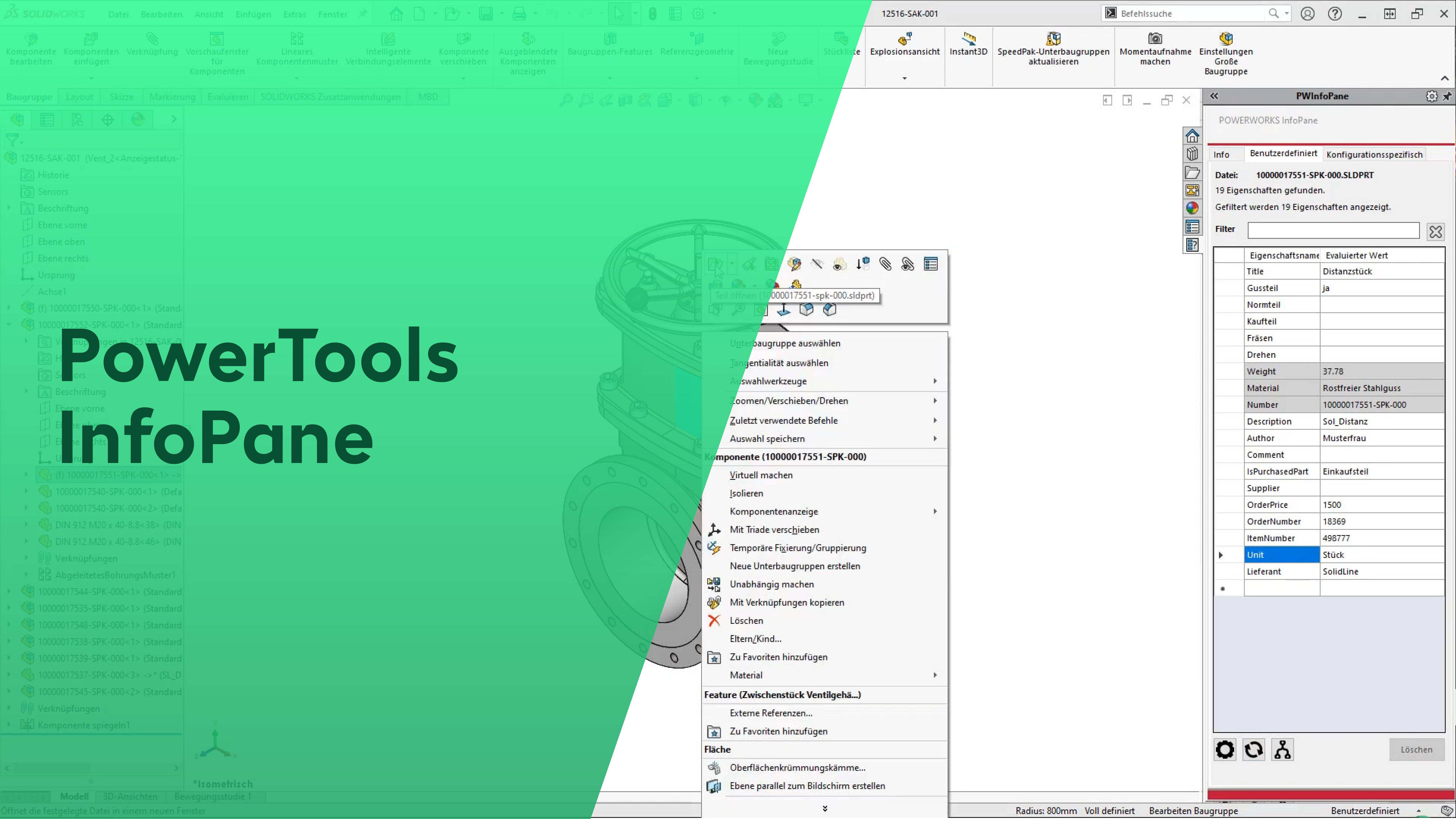 PowerTools InfoPane unterstützt Sie dabei, die Konsistenz der Dateieigenschaften Ihrer SOLIDWORKS Dokumente kontinuierlich im Blick zu behalten. Das User Interface von Powertools InfoPane ist in den Task-Fensterbereich von SOLIDWORKS integriert und stellt alle Dateieigenschaften eines selektierten oder aktiven SOLIDWORKS Dokuments in Echtzeit dar – ohne dafür extra in den Dateiinformationsdialog von SOLIDWORKS wechseln zu müssen.