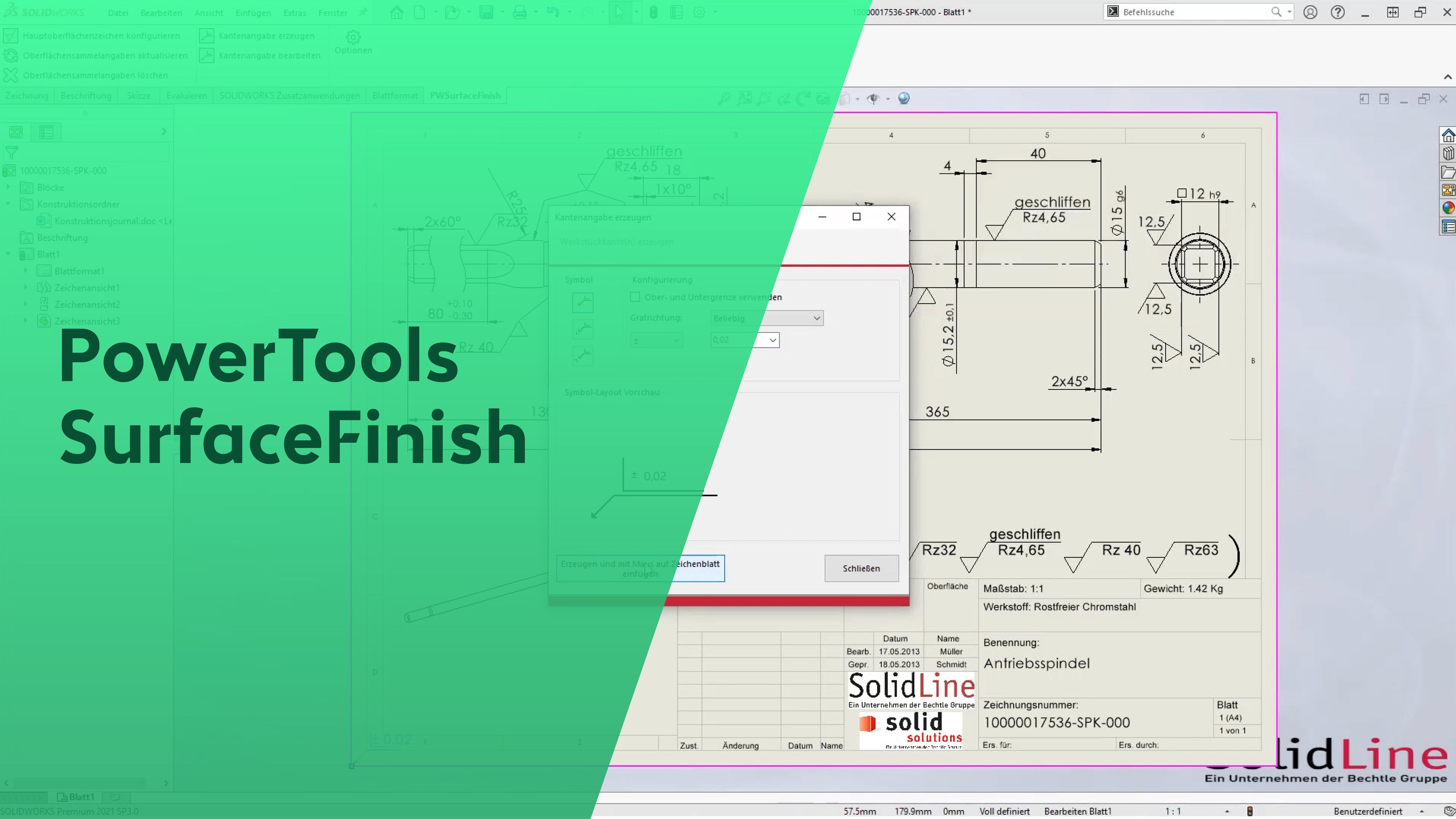 PowerTools SurfaceFinish ermöglicht es Ihnen, die Erstellung von Sammelangaben für Oberflächenzeichen in Ihren SOLIDWORKS Zeichnungen zu automatisieren. Mit PowerTools SurfaceFinish werden alle vorhandenen Oberflächenzeichen mit nur einem Mausklick zusammengefasst und an gewünschter Stelle eingefügt.