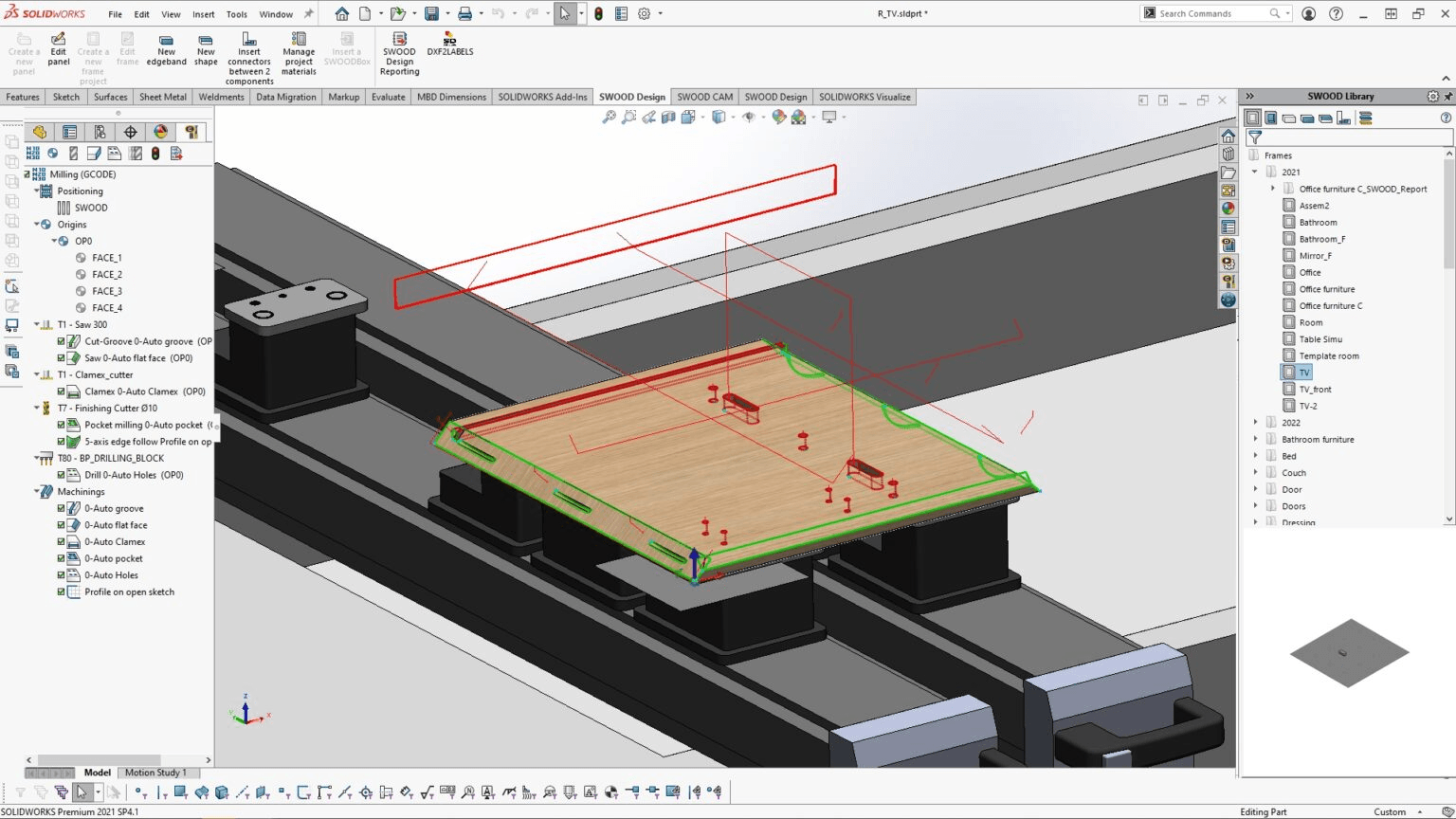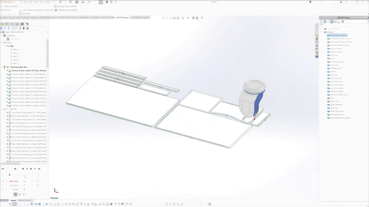 Mit SWOOD CAM wird das 3D-Modell zur direkten Fertigungsgrundlage. Das CAM-Modul generiert automatisch Bearbeitungswege und sorgt für eine präzise Maschinenansteuerung. Mit SWOOD CAM entfällt der Umweg über externe CAM-Systeme: Werkzeugwege entstehen direkt aus dem 3D-Modell – präzise, automatisiert und vollständig in SOLIDWORKS integriert. Ob Bohrung, Fräsung oder Taschen – die Bearbeitungen werden kontextabhängig erzeugt und lassen sich über individuell konfigurierbare Regeln steuern.