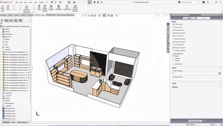 Exportieren Sie mit einem Klick einen vollständigen Bericht uns stellen Sie eine direkte Verbindung zwischen SWOOD, der Werkstatt, dem Informationssystem und anderen Abteilungen her. Produktionsinformationen werden direkt von den Konstruktionsdaten in die Programmierungen und Fertigungsdokumentation integriert.