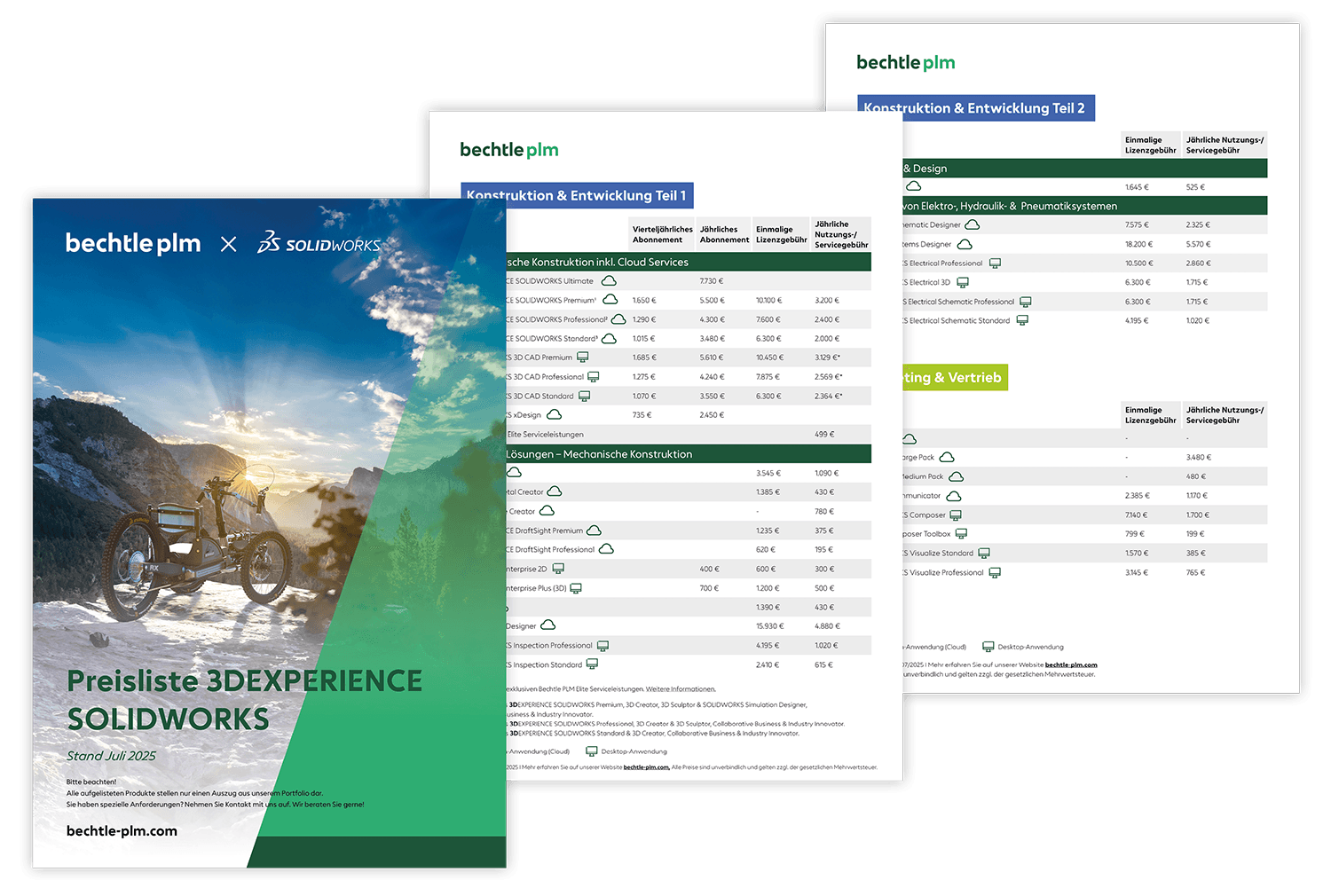 Sie suchen die gültigen Preise für Composer, Simulation, Electrical, Visualize oder 3DEXPERIENCE SOLIDWORKS-Lösungen? Mit der SOLIDWORKS Preisliste 2025 erhalten Sie alle aktuellen Informationen in einer Übersicht.
