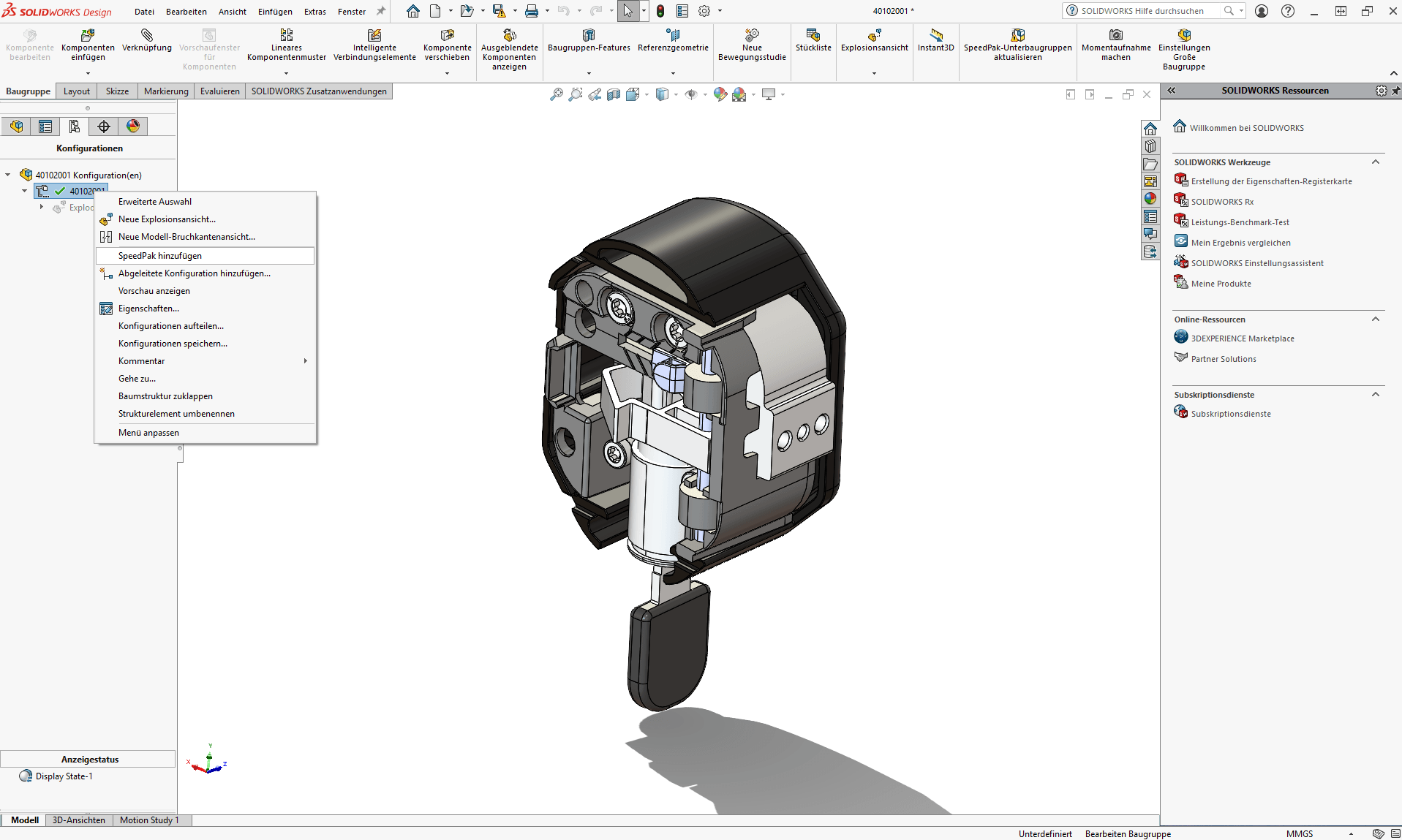 SpeedPak erzeugt eine vereinfachte Repräsentation einer Baugruppe. Dabei bleiben nur die für Beziehungen und Ansichten relevanten Flächen erhalten. Für übergeordnete Baugruppen reicht das meist völlig. Durch den abgespeckten Datensatz lässt sich das Modell schneller bewegen und lädt zügiger.