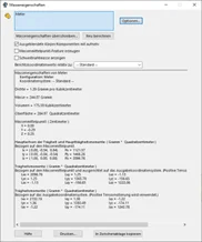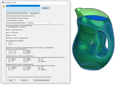 In diesem Dialogfeld werden neben dem Volumen des Körpers, Teils oder auch einer Baugruppe weitere relevante Informationen bereitgestellt, wie z.B. das Gewicht, der Massenmittelpunkt oder Gesamtoberfläche des Models. Über die Optionen können die Einheiten der Masse, Länge und Volumen definiert werden.