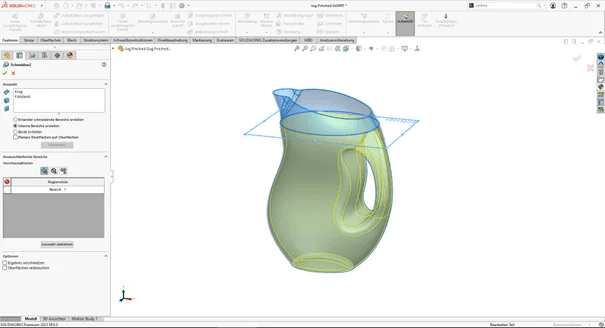 Um den Volumen (Inhalt) eines Behältnisses zu ermitteln bedarf es einer kleinen Vorbereitung. Ein hohler Grundkörper ist die erste Voraussetzung für die Ermittlung. Über das Feature Wandung, lässt es sich schnell realisieren. Im zweiten Schritt wird eine Ebene erstellt, die den Füllstand simuliert.