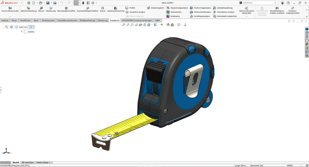 Klicken Sie auf “Ansicht” in der oberen Menüleiste.Wählen Sie “Lineal” aus dem Dropdown-Menü.Bewegen Sie den Mauszeiger über den Bereich, den Sie messen möchten. Die Entfernung wird in der Statusleiste am unteren Rand des SOLIDWORKS -Fensters angezeigt.