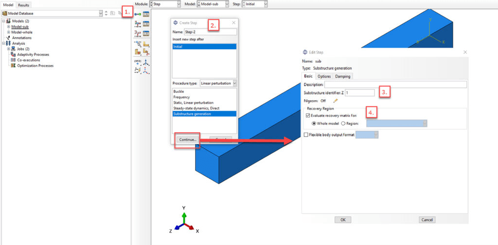 Legen Sie im „STEP“-Modul einen Berechnungsschritt an, der die reduzierte Steifigkeit und Masse der Substruktur berechnet. (1) + (2)