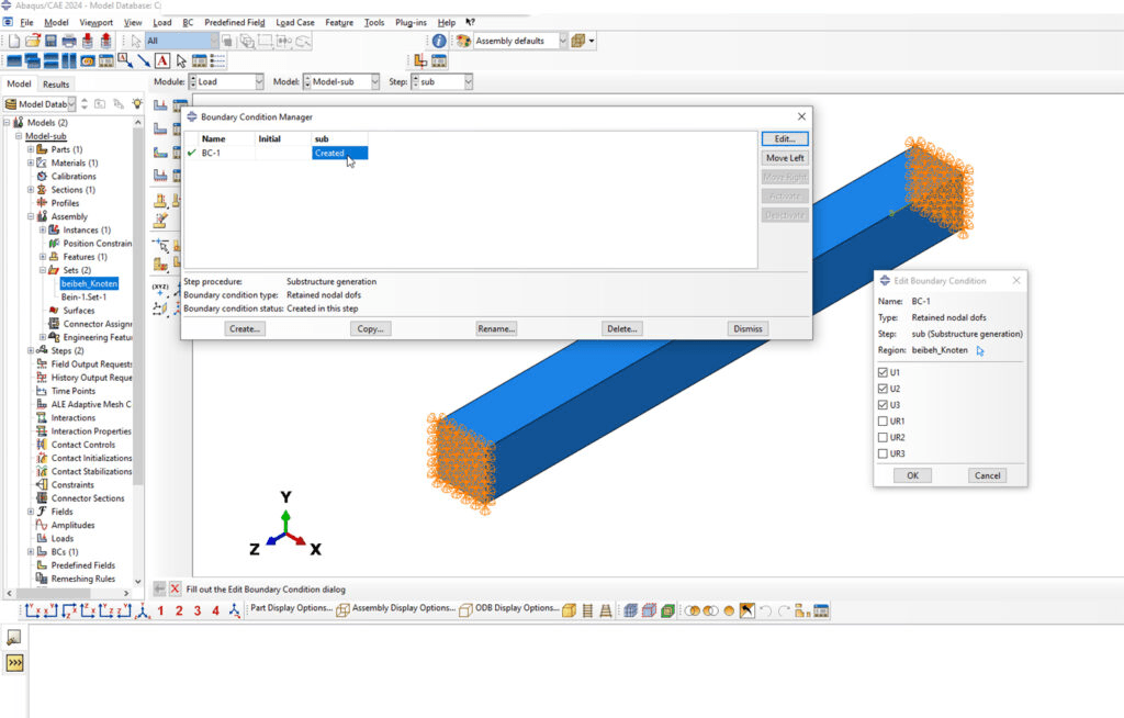 Schnittstellenknoten definieren: Erstellen Sie im „ASSEMBLY“-Modul ein Node-Set, das die Knoten enthält, die als Schnittstellen zum Hauptmodell dienen. Diese Knoten repräsentieren die „Retained Degrees of Freedom“.
